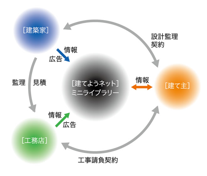 建てようネットは建築家との家づくりを無料でサポートするシステムです。その仕組みをご理解してもらった上でご来場ください。利用者に無料で建築家を紹介するために、コストを徹底的に抑えた画期的なシステムです。